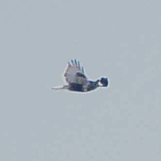 A Rough-legged Hawk seen in Armstrong County during a winter raptor survey. Rough-legged Hawks appear in two different morphs, light and dark. This is a light-morph Rough-legged Hawk. It has a dark belly band, dark wrist markings in the wings, and a tail that has a dark band with a white inner band. This individual is probably an immature bird since it has a totally solid dark belly band (they are lighter or more mottled in adults). Small numbers of Rough-legged Hawks are seen at Allegheny Hawk Watch in both the spring and fall seasons.