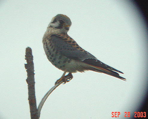 This is a male American Kestrel. Male American Kestrels typically have a rufous back and bluish-gray wings. Females tend to have rufous-brown backs and wings. American Kestrels are the smallest falcons found in the Eastern United States. This is a digiscope shot taken at approximately 160X.