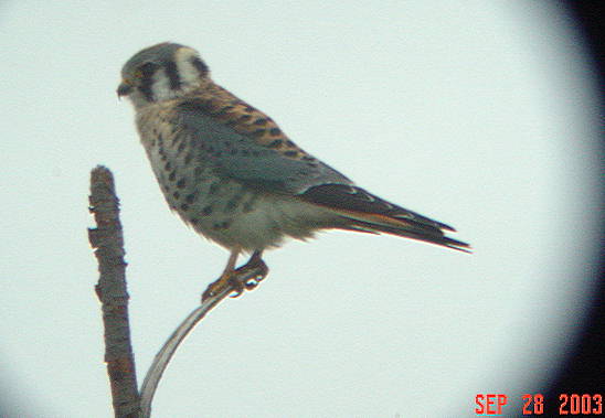 Another shot of the male American Kestrel seen at Allegheny Front Hawk Watch on 28 September 2003. This individual made a pass at the owl decoy and then alit on the trees on the north point of the watch. It seemed rather mystified by the owl decoy and people on the ground around it. It checked the decoy and us out and finally continued on its migration south. This digiscope shot was also taken at approximately 160X.