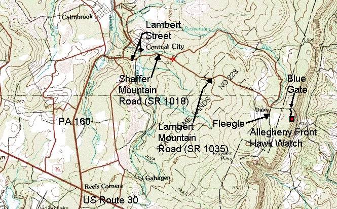 Directions to Allegheny Front Hawk Watch from the Reels Corner intersection of U.S. Route 30 and PA Route 160 are as follows: turn north onto PA Route 160 at Reels Corner. Take PA 160 into Central City for approximately 3.8 miles and turn (actually you will go straight) onto Lambert Street (SR 1018). You will go over a railroad crossing. After the railroad crossing Lambert Street turns left (approximately 0.5 miles from the intersection with PA 160). Do not make the left but continue straight on SR 1018 which is then named Shaffer Mountain Road. Continue on Shaffer Mountain road for 0.8 miles and make a right hand turn onto Lambert Mountain Road (SR 1035). Take Lambert Mountain Road for approximately 2.9 miles into the little village of Daley. Lambert Mountain Road turns left at this point and Fleegle comes in from the right. Continue straight at the intersection up a tar-and-chip road and past the Daley Cemetery which will be on the right. Approximately 0.5 miles up the tar-and-chip road (which will become dirt and chip) there will be a blue metal gate on the right. That is the entrance to Allegheny Front Hawk Watch. If the gate is open (and it will be when the site is staffed), go down that road to the parking area (approximately 0.25 miles from the gate). Walk east over the low rise to the actual watch site from the parking area. Click here to view a map of the area.