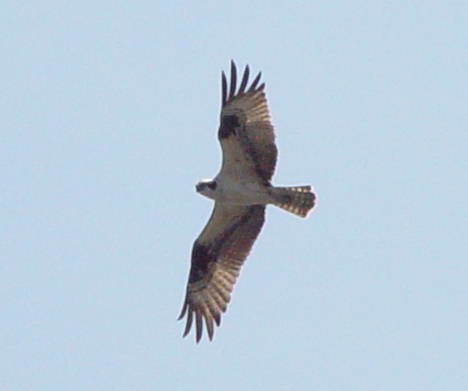 This adult Osprey is probably a male since it lacks a strong dark necklace around its neck. Osprey are often called fish hawks since they live primarily off the fish they catch. The are commonly seen in September during the fall migration.