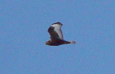 A Rough-legged Hawk seen in Armstrong County during a winter raptor survey. Rough-legged Hawks appear in two different morphs, light and dark. This is a light-morph Rough-legged Hawk. It has a dark belly band, dark wrist markings in the wings, and a tail that has a dark band with a white inner band. This individual is probably an immature bird since it has a totally solid dark belly band (they are lighter or more mottled in adults). Small numbers of Rough-legged Hawks are seen at Allegheny Hawk Watch in both the spring and fall seasons.